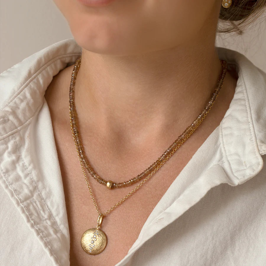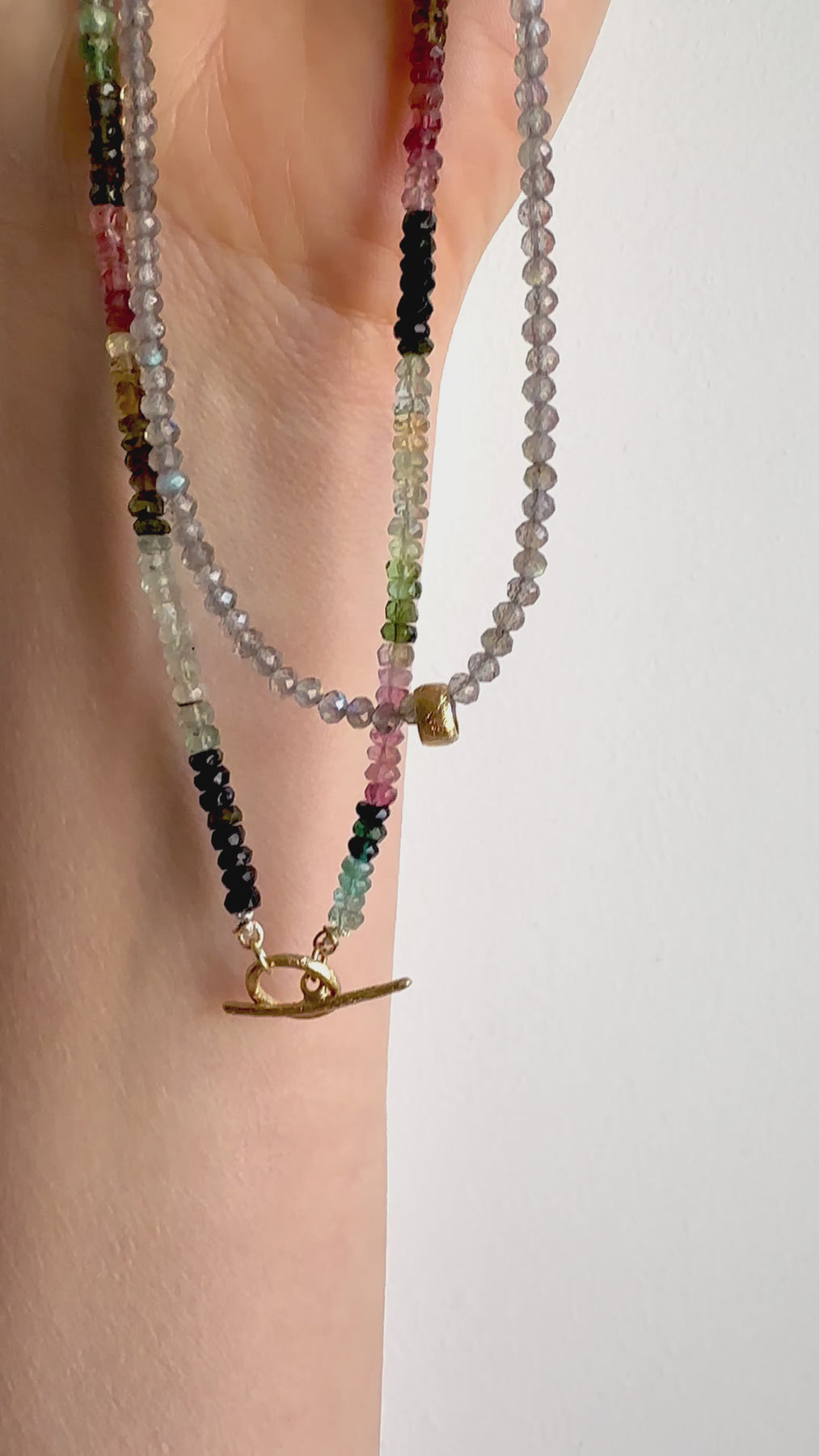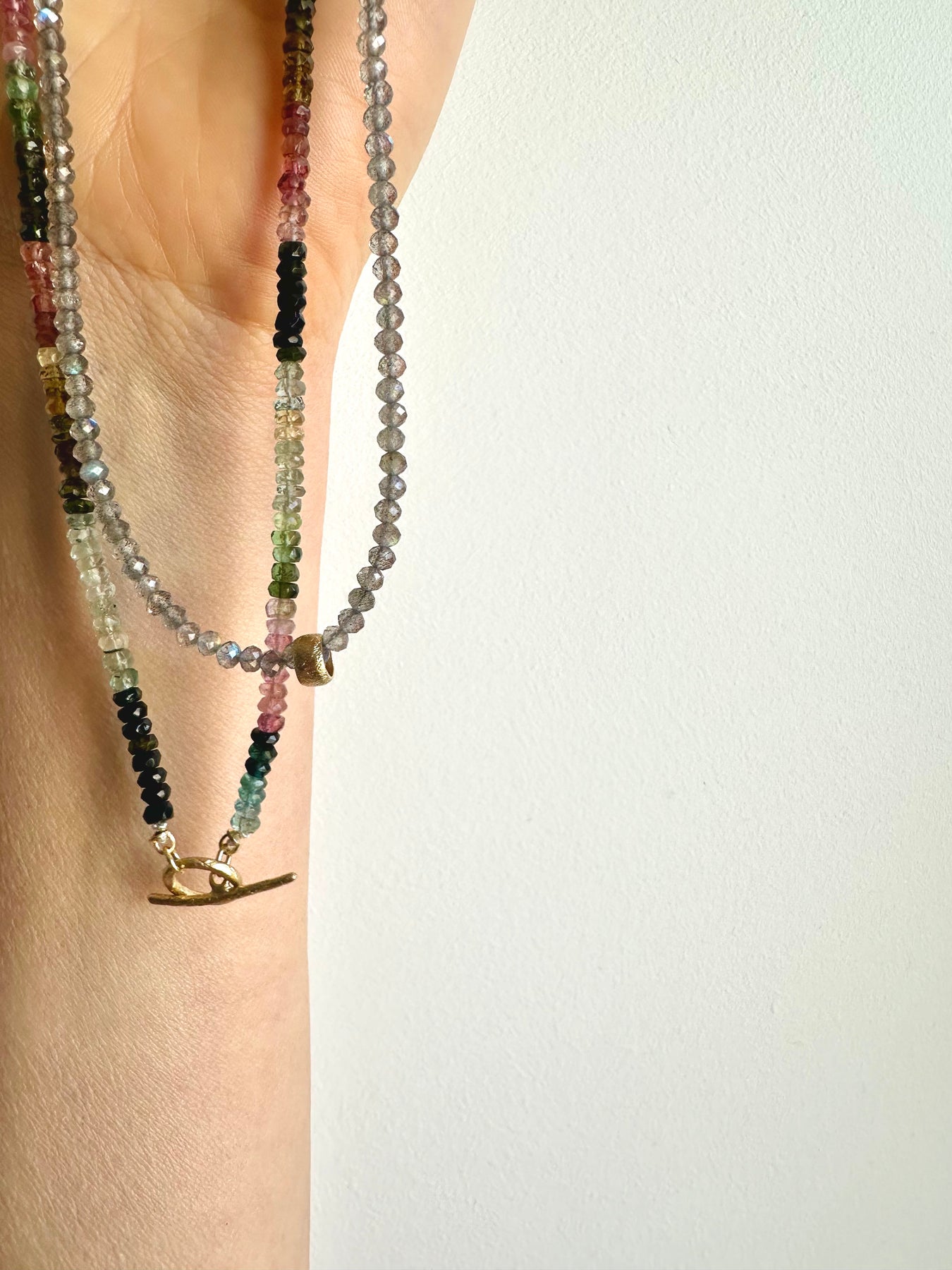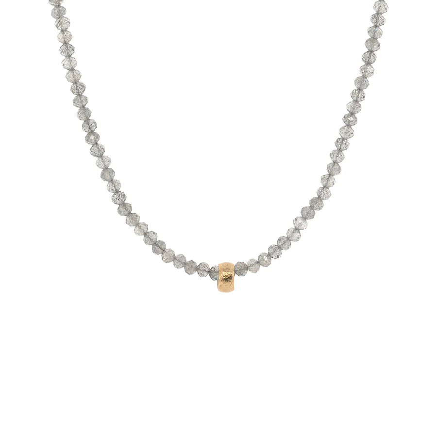 Bold Sparkling labradorite gemstone beads are punctuated by our hand carved boulder textured bead which naturally settles in the center front.