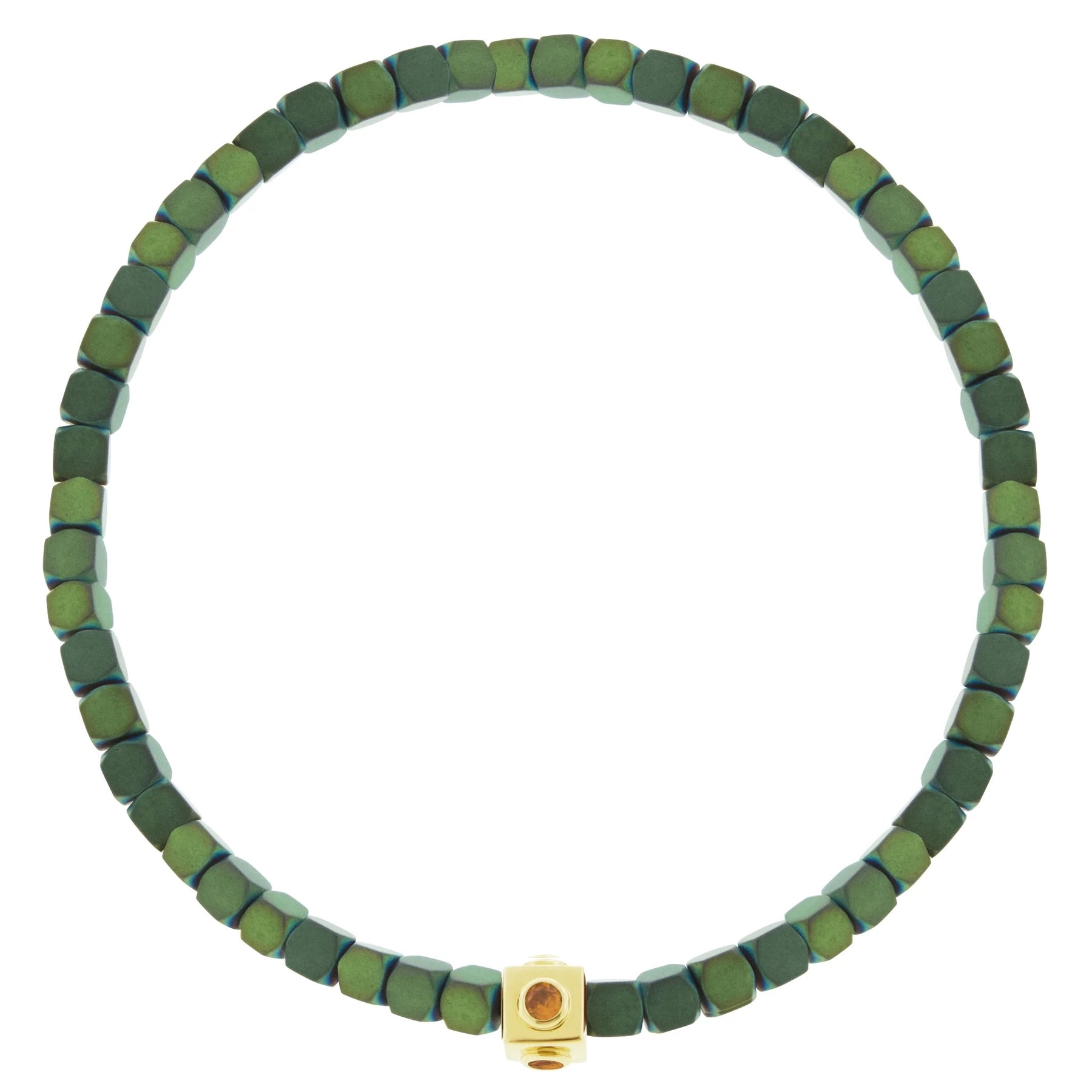 Featuring dark green hematite stones with a 14k yellow gold Lego cube with multicolored sapphires.