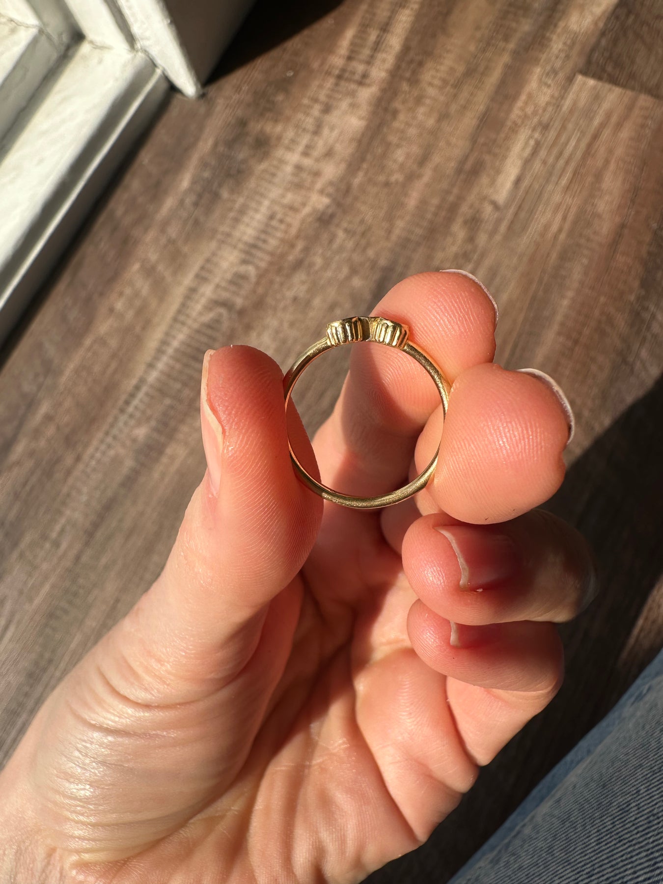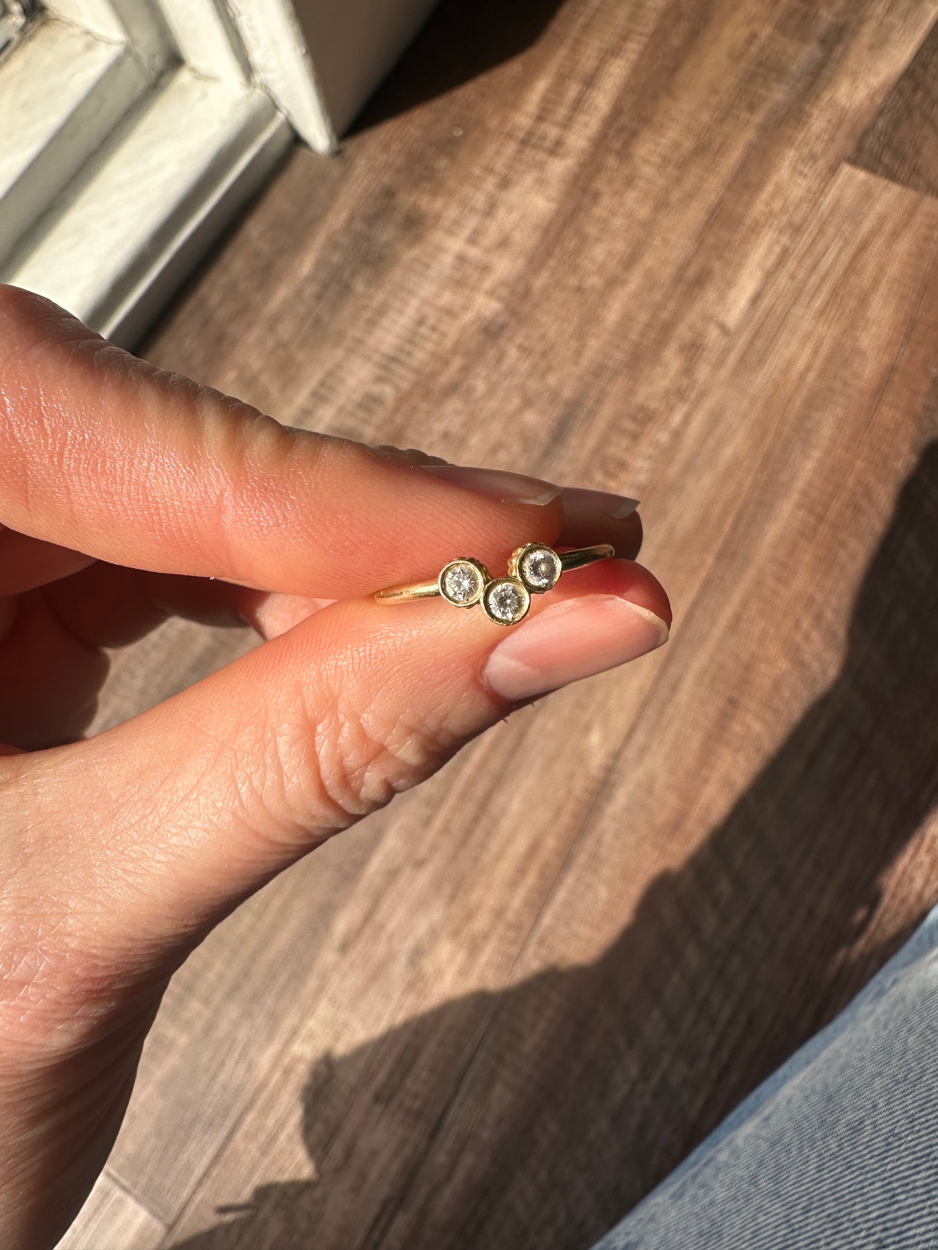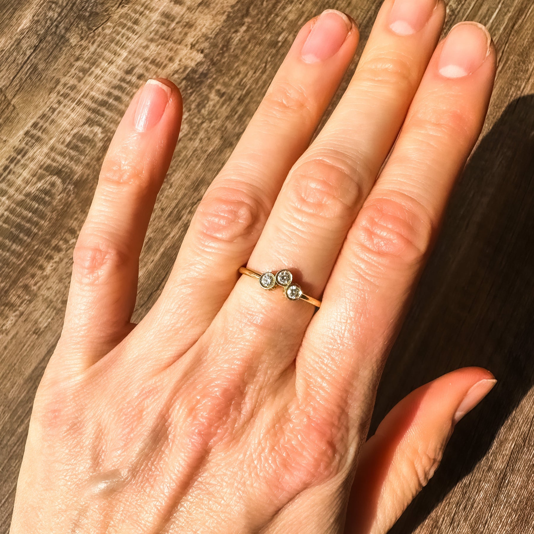 This sweet and simple 18k yellow gold ring is your next favorite stacker. The rounded band is set with three, brilliant cut round diamonds (approximately .16ct) in ribbed, bezel settings. Slightly positioned off the band, this ring would stack perfectly with one you already have in your collection.